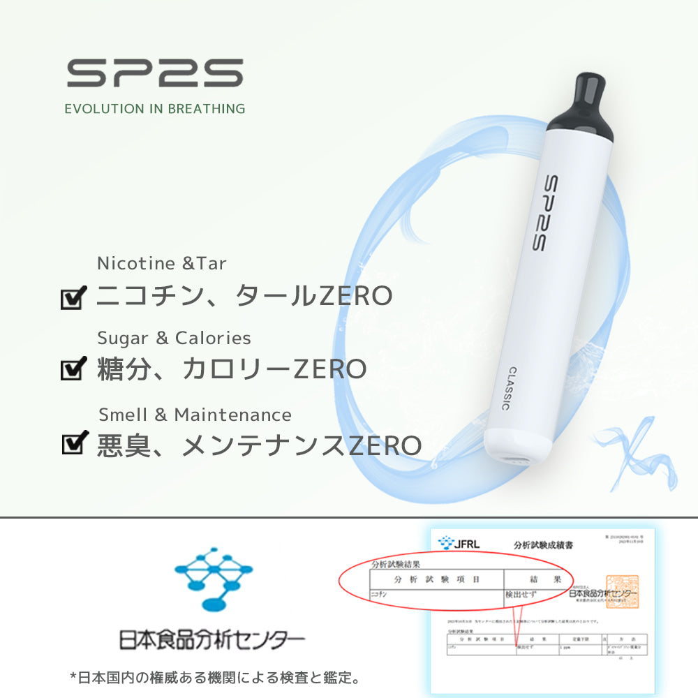 ニコチン0 タール0 ◆マウスピースハンドフリー設計 ◆塗装焼き付けで高級感漂う ◆大容量バッテリ ◆オイル漏れ防止 ◆どんな角度でも吸える ◆タイプCスピード充電 ◆ SP2S CLASSIC本体は永久保証付き。